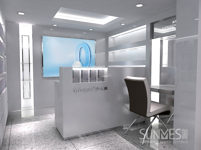 敷尚美化妆品专卖店,地点在广州万达广场,总共实用面积32平方米,虽面积不大,功能设计齐全,划分了前台收银区、产品展示区、休息区、形象展示区,整体色调以白色为主基调设计,光线采用灯带柔光处里,增强了客户选择产品舒式度,休息区可以用来试用产品和洽谈,造形天花与洽谈桌相互应,可集中客户注意力和试用产品的良好体验感!